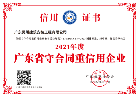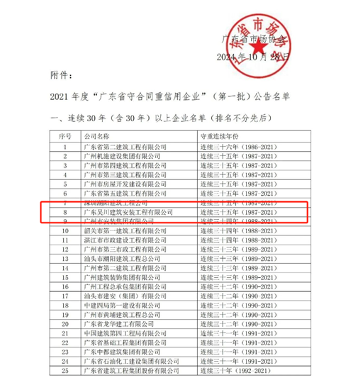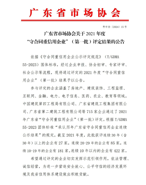 近日,廣東省市場協會發布了2021年度“守合同重信用企業”(第一批)評定結果,我公司榮耀再續,連續三十五年“廣東省守合同重信用企業”稱號。獲得此榮譽,不僅對公司實力的認可,更是對誠信經營和優質服務的肯定。